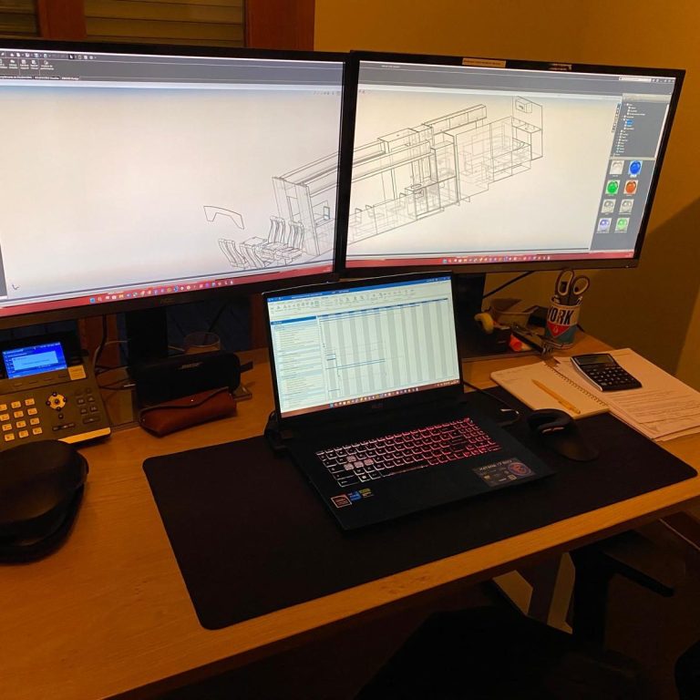Nous réalisons la conception 3D dans les moindres détails: intégration de l'environnement, feuille de débit, calepinage, liste des matériaux, appareillages, quantité, référencement, coût.